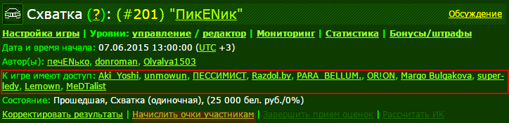 Итак, дабы не раздувать из мухи слона, и вернуть состояние вселенной к покою: Лишним игрокам - ДНФ. Лишние кнопки - временно отключены у нескромного автора. Р.S. Решение принято на основе опроса игроков, авторов, статистики, здравого смысла. P.Р.S. Печенько, может попросить кнопки в любое время у любого из администраторов ДЛЯ ПРОВЕДЕНИЯ БУДУЩИХ ИГР.