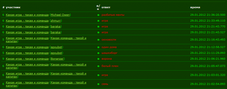 Вы считаете время от последнего взятого бонуса до автоперехода. То есть, приведем пример:  Последним верным ответом у нас была тридцать первая весна, ибо один день, афера, семь, один дома - остаточные ответы, если вы посмотрите ниже, они уже были взяты нашей командой куда раньше. Так вот. Последний верный ответ был в 21.07.16. Автопереход в 22.30, следовательно, нашей команде нужно начислить бонус в размере 82 минуты. 44 секунды. Далее смотрим. Последний правильный ответ у этой команды - окновости. Игра так же является остаточным ответом. Последний ответ у них был в 21.16.43, следовательно, команде начисляется штраф за взятый ответ с ментами, чтобу вернуть все на места, и начисляется бонус в размере 73 минуты 17 секунд.